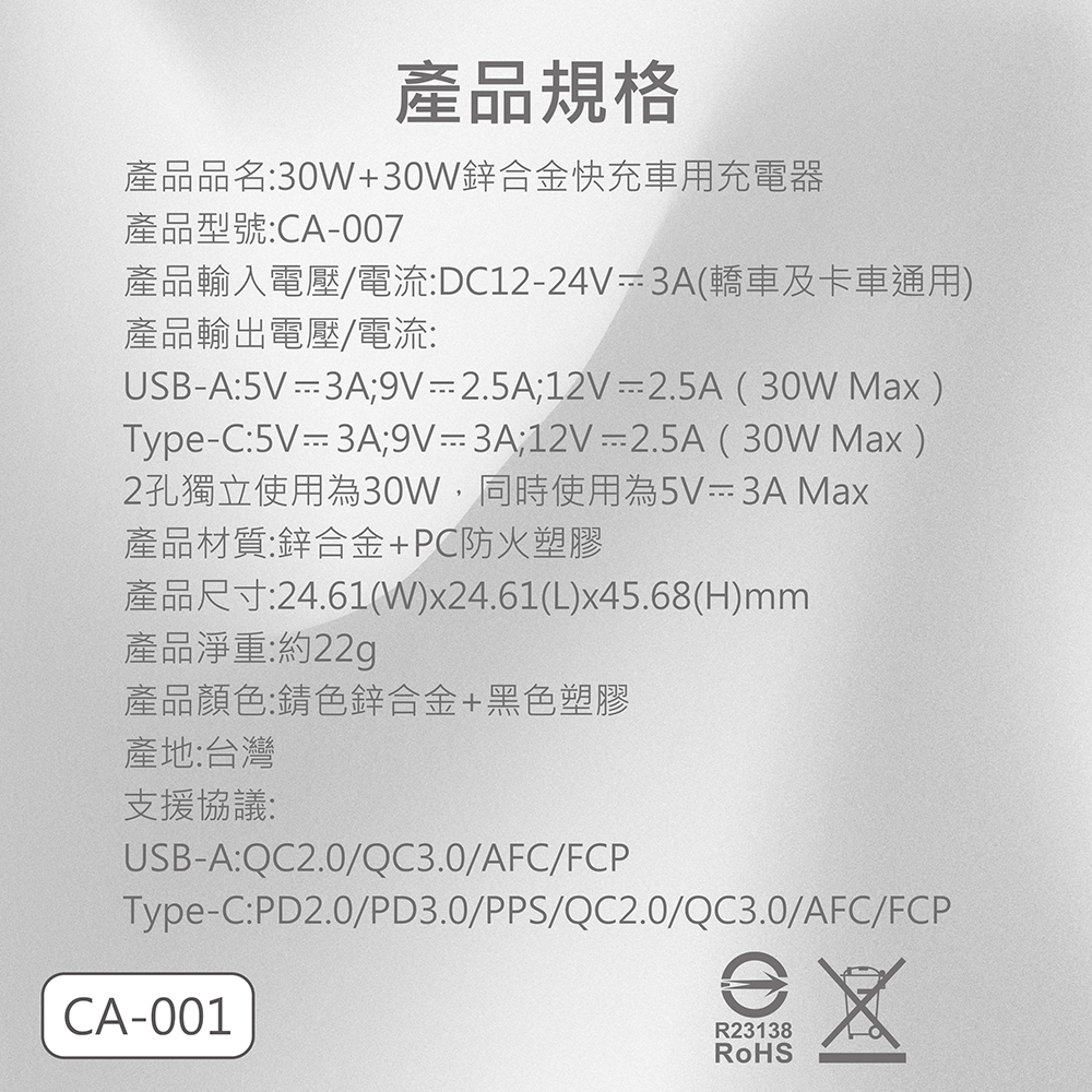 CA-007 30W+30W鋅合金快充車用充電器