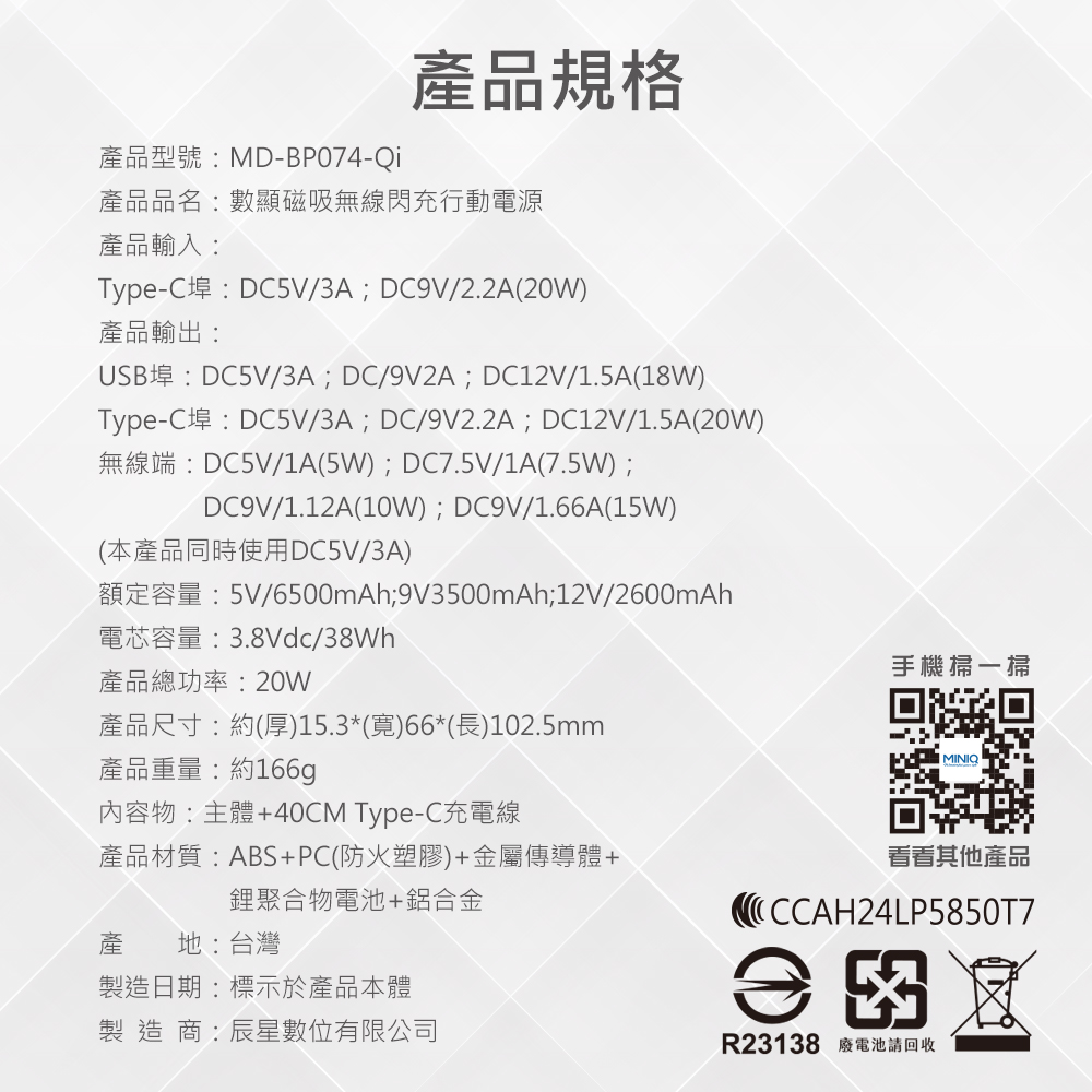 MD-BP074-Qi 數顯磁吸無線閃充行動電源